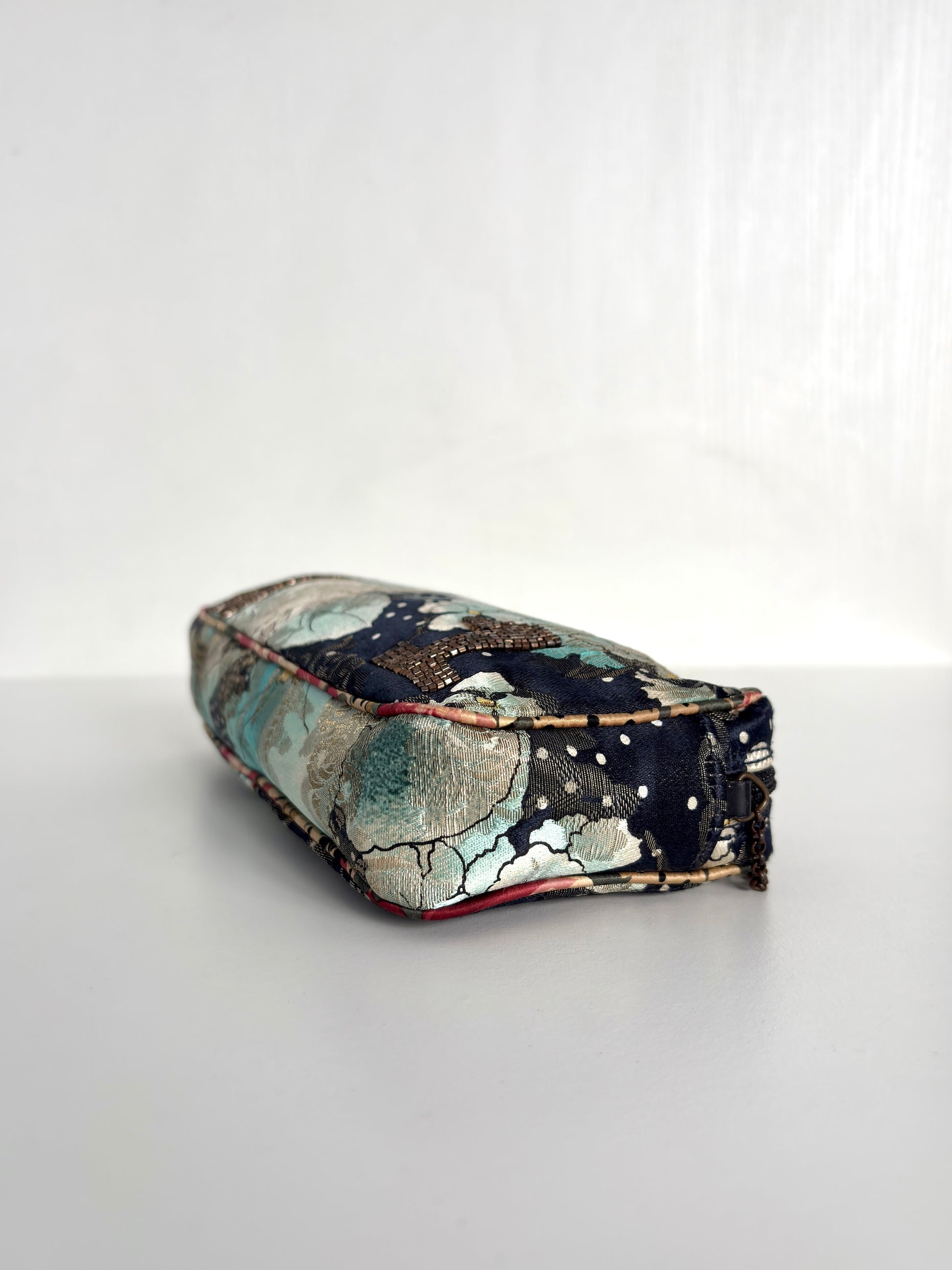 A limited-edition Dior shoulder bag from the FW 2001 collection, crafted in silk floral jacquard with rhinestone embellishments. Features silver-tone Lampo zipper, fabric interior, and original Dior dustbag.