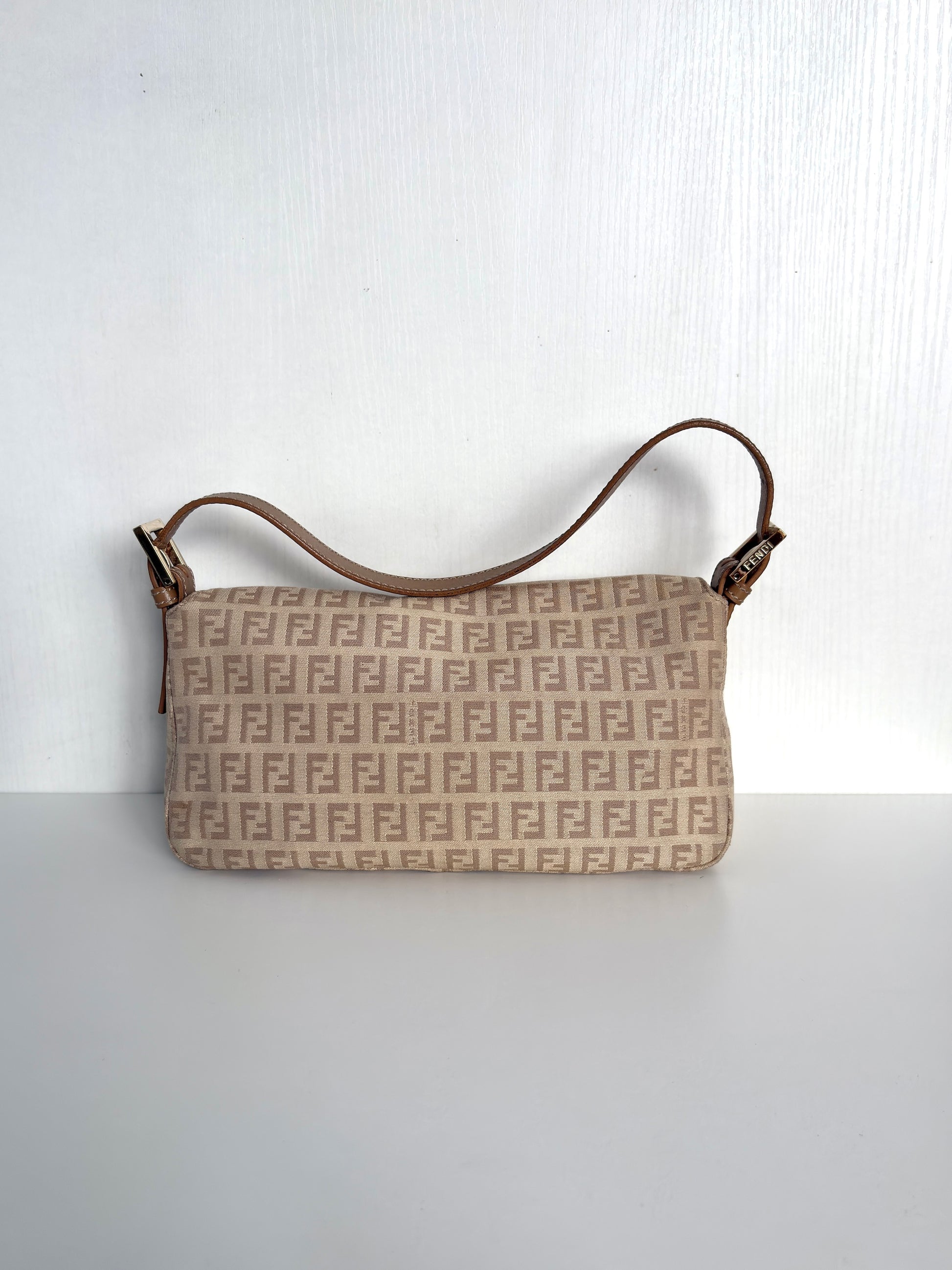 A taupe Zucchino baguette crafted in canvas with leather trim. Features a double-flap design, flat leather strap, exterior and interior zip pockets, and gold-tone hardware.